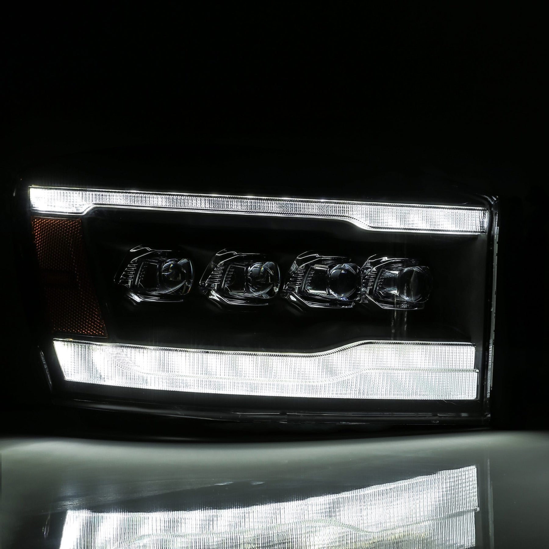 These 3rd gen Dodge Ram NOVA-Series projector headlights draw their design inspiration from the 5th generation Ram trucks, seamlessly adapted for the 3rd generation Ram models. Featuring top and bottom light tubes serving as DRL light bars in white LED, the bottom tube also functions as a sequential turn signal light with amber LED illumination. At the heart of these headlights is our signature NOVA LED look with quad projectors.