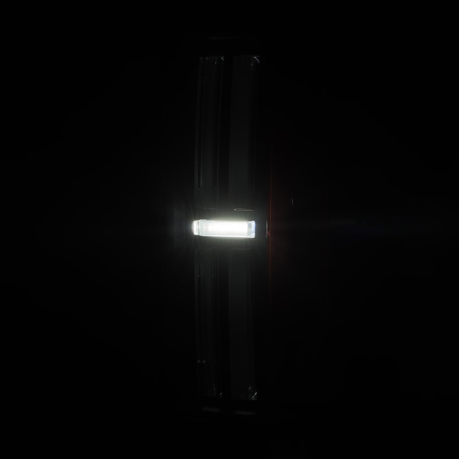 The trapezoidal prisms illuminate with red LEDs for parking lights, intensifying when braking. For turn signals, red LEDs activate across the prisms and the LED side panel in a dynamic sequential flow, adding a modern touch. The side LED tube mirrors the signature look of the 3rd Gen Tundra, providing additional parking light functionality, while the central LED tube lights up with white LEDs as a reverse indicator.