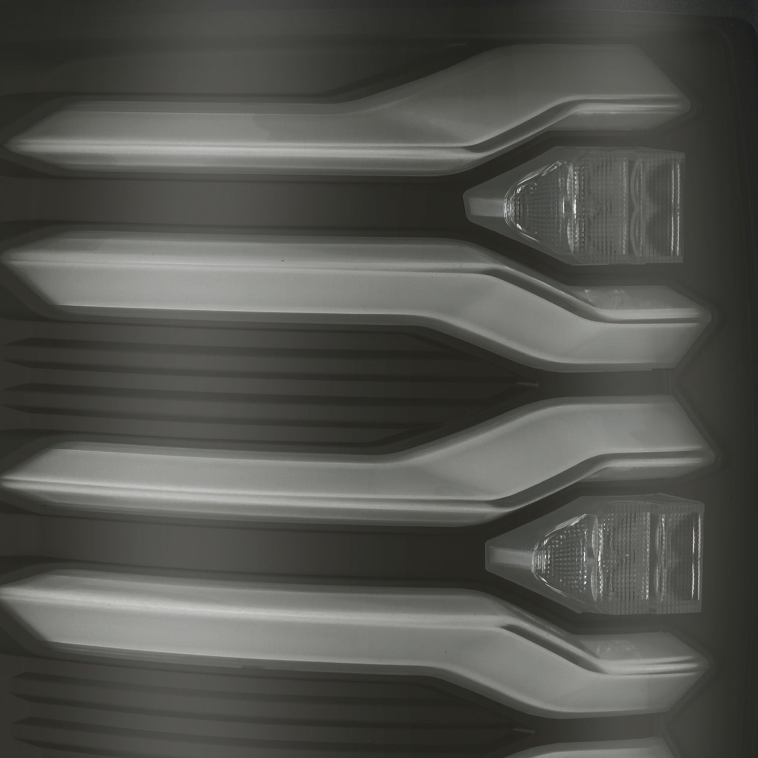 These 12th Gen Ford F-150 LUXX-Series LED Tail Lights feature three pairs of switchable LED tubes, delivering vibrant red illumination for parking and brake lights, while integrated amber LEDs provide dynamic sequential turn signals. Between the LED tubes, diffuser lenses enhance daytime visibility by incorporating additional LEDs for brake and sequential turn signal functions.