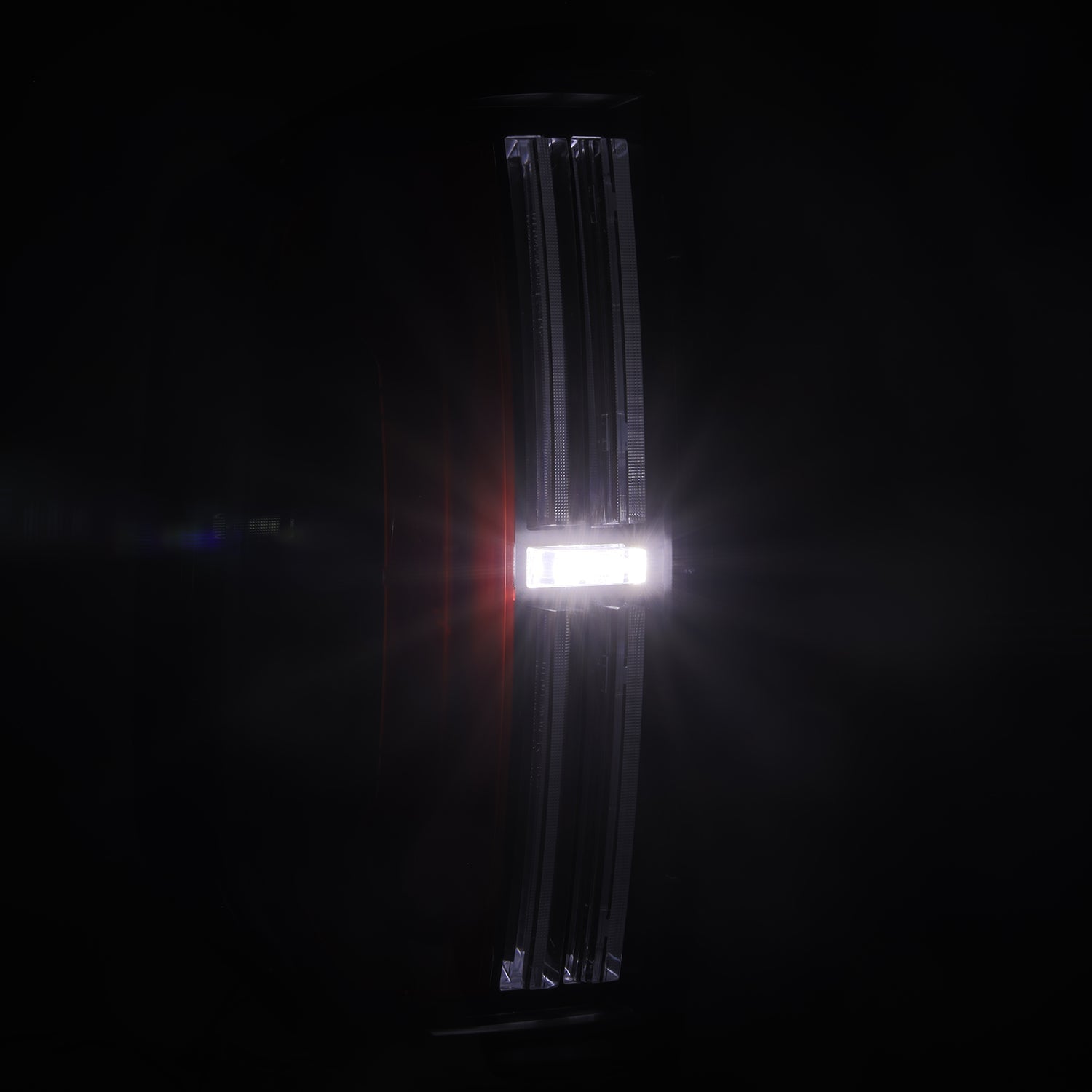 The trapezoidal prisms illuminate with red LEDs for parking lights, intensifying when braking. For turn signals, red LEDs activate across the prisms and the LED side panel in a dynamic sequential flow, adding a modern touch. The side LED tube mirrors the signature look of the 3rd Gen Tundra, providing additional parking light functionality, while the central LED tube lights up with white LEDs as a reverse indicator.