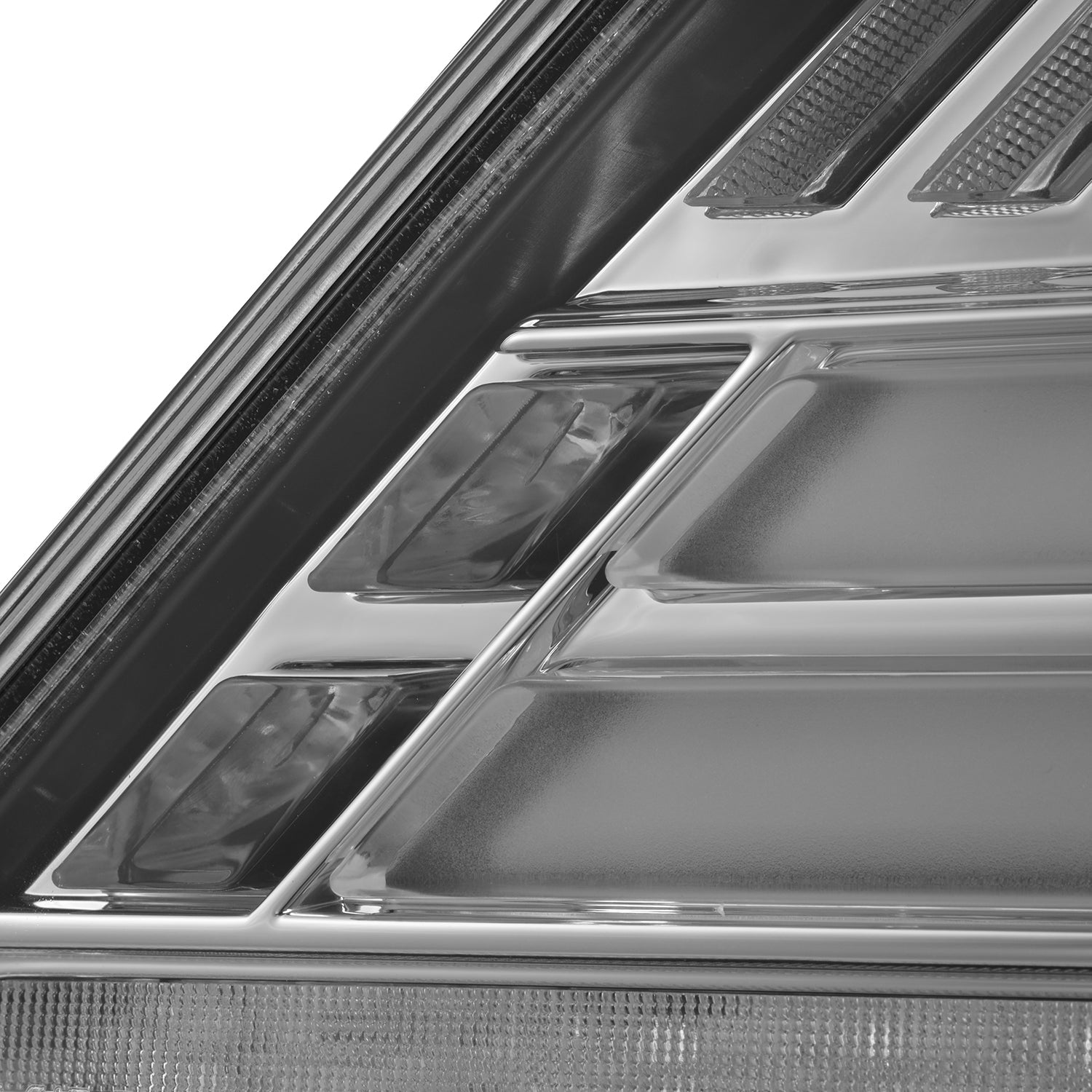 These tail lights feature dual LED tubes serving as red parking lights, with trapezoidal prisms in the center for a modern 3D effect during the day, which also function as red brake lights. At the end of each dual LED tube, two prisms provide white LED reverse lights, ensuring optimal visibility in low-light conditions. Additionally, a clear LED bar at the bottom offers the flexibility to function as either a sequential or blinking amber turn signal.