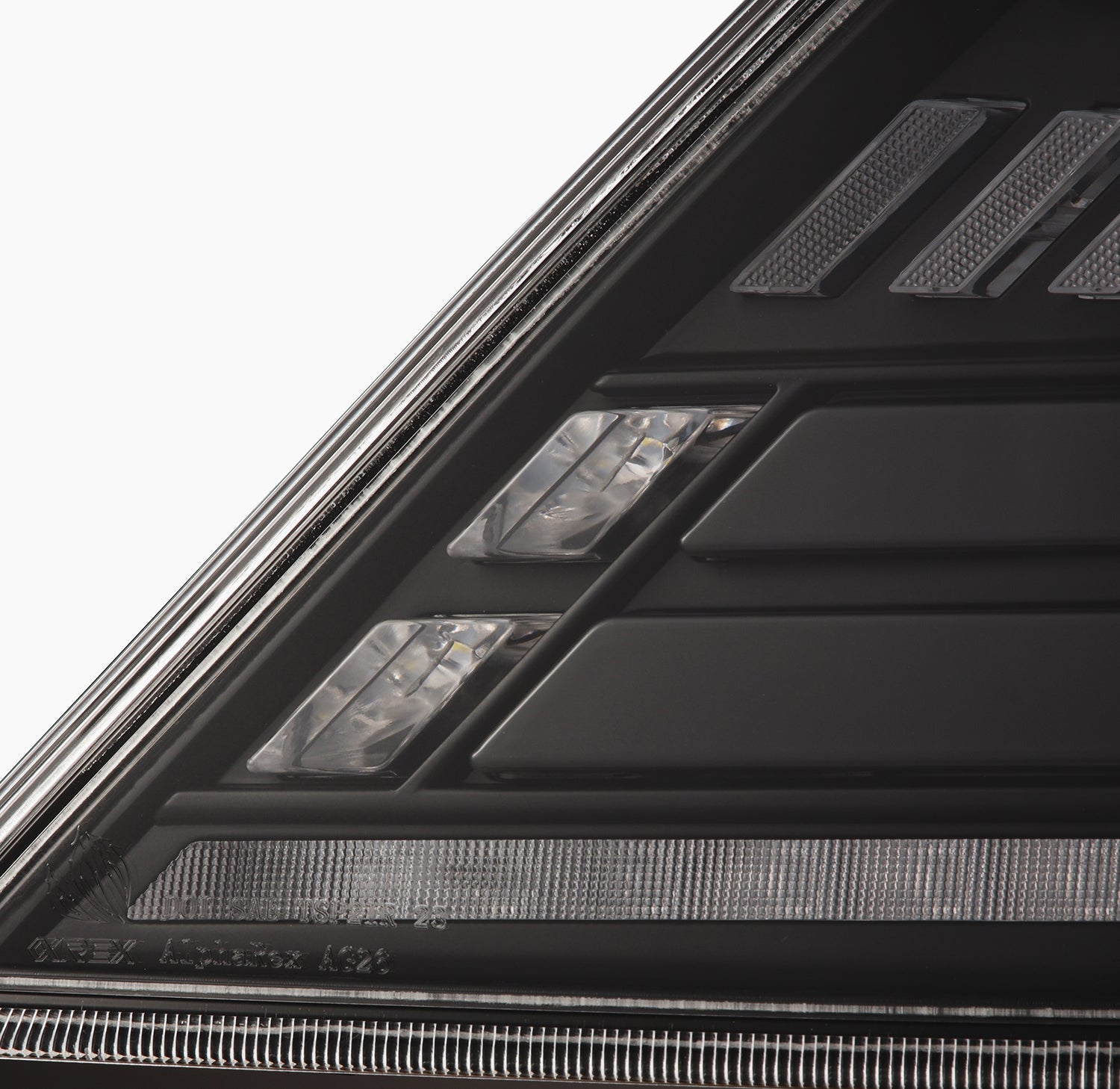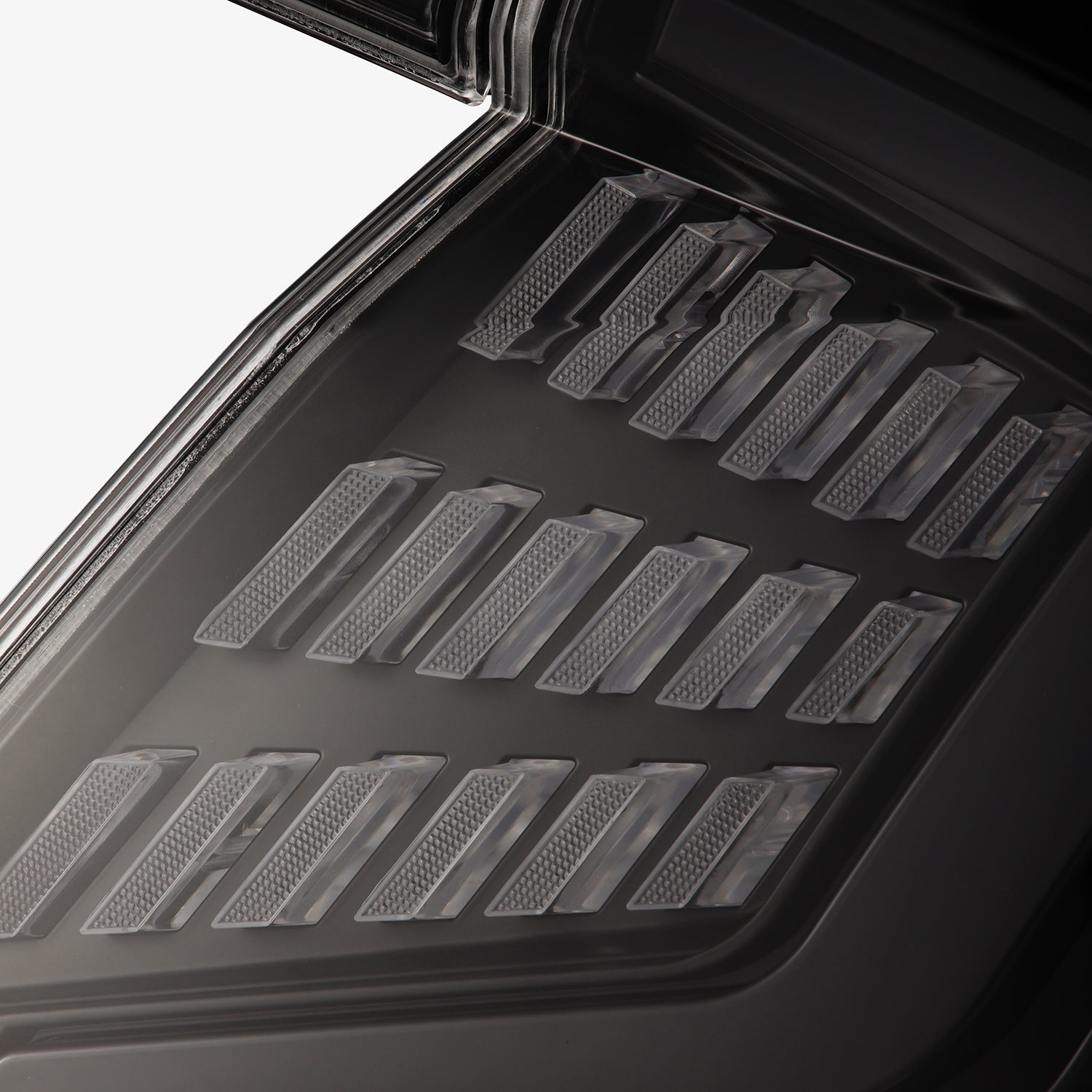 These tail lights feature dual LED tubes serving as red parking lights, with trapezoidal prisms in the center for a modern 3D effect during the day, which also function as red brake lights. At the end of each dual LED tube, two prisms provide white LED reverse lights, ensuring optimal visibility in low-light conditions. Additionally, a clear LED bar at the bottom offers the flexibility to function as either a sequential or blinking amber turn signal.