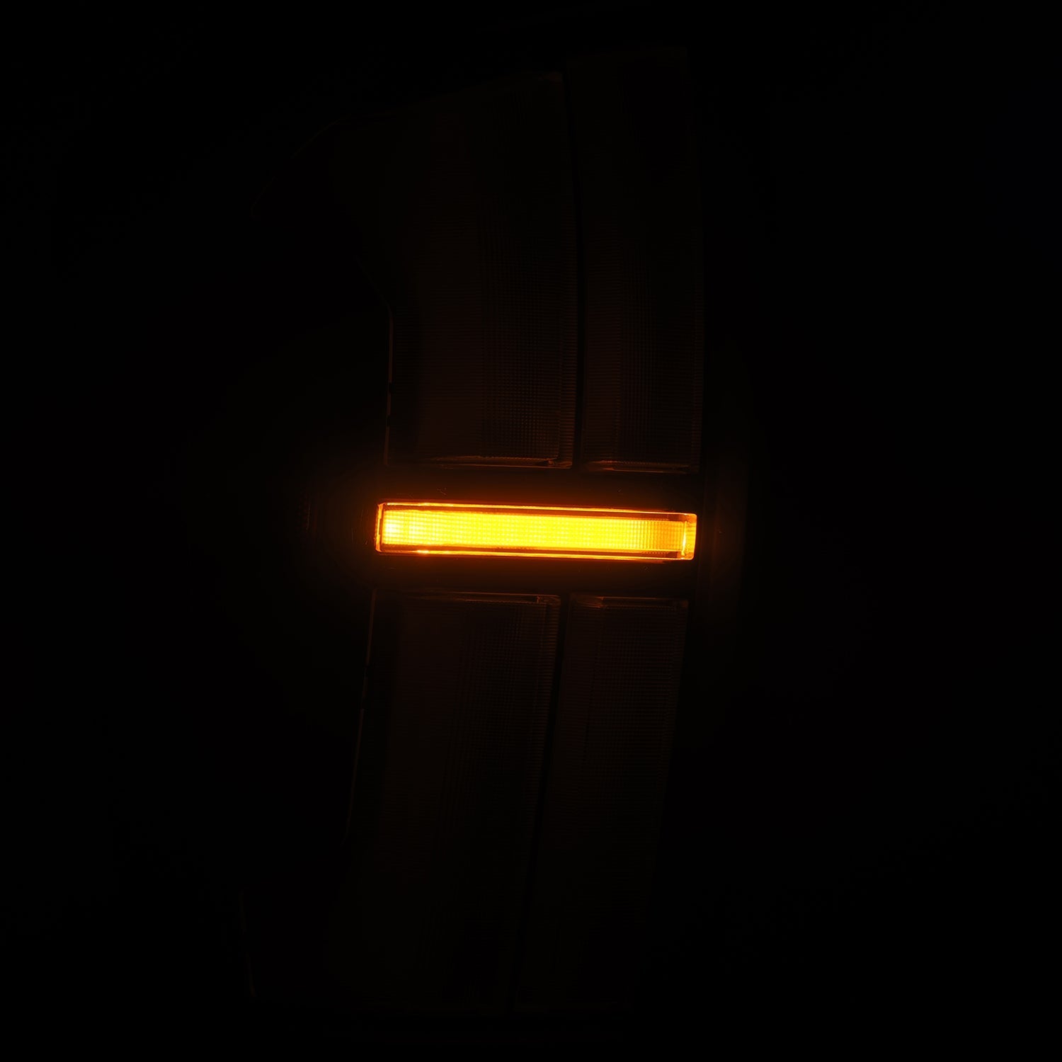 The trapezoidal prisms illuminate with red LEDs for parking lights, intensifying when braking. For turn signals, amber LEDs activate at the center bar between the prisms in a dynamic sequential flow, adding a modern touch. The bottom two LED prismatic tubes light up with white LEDs as a reverse indicator.