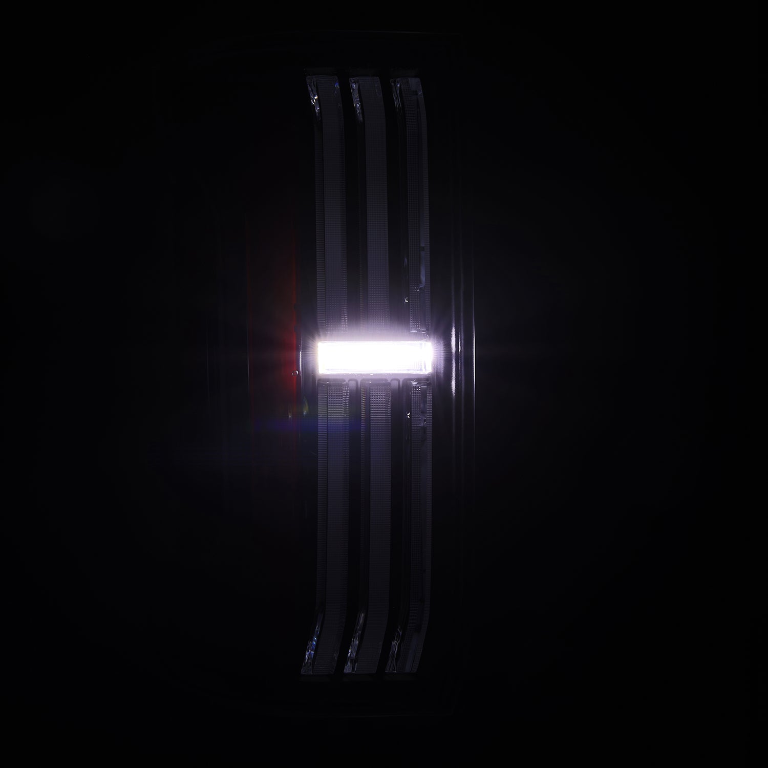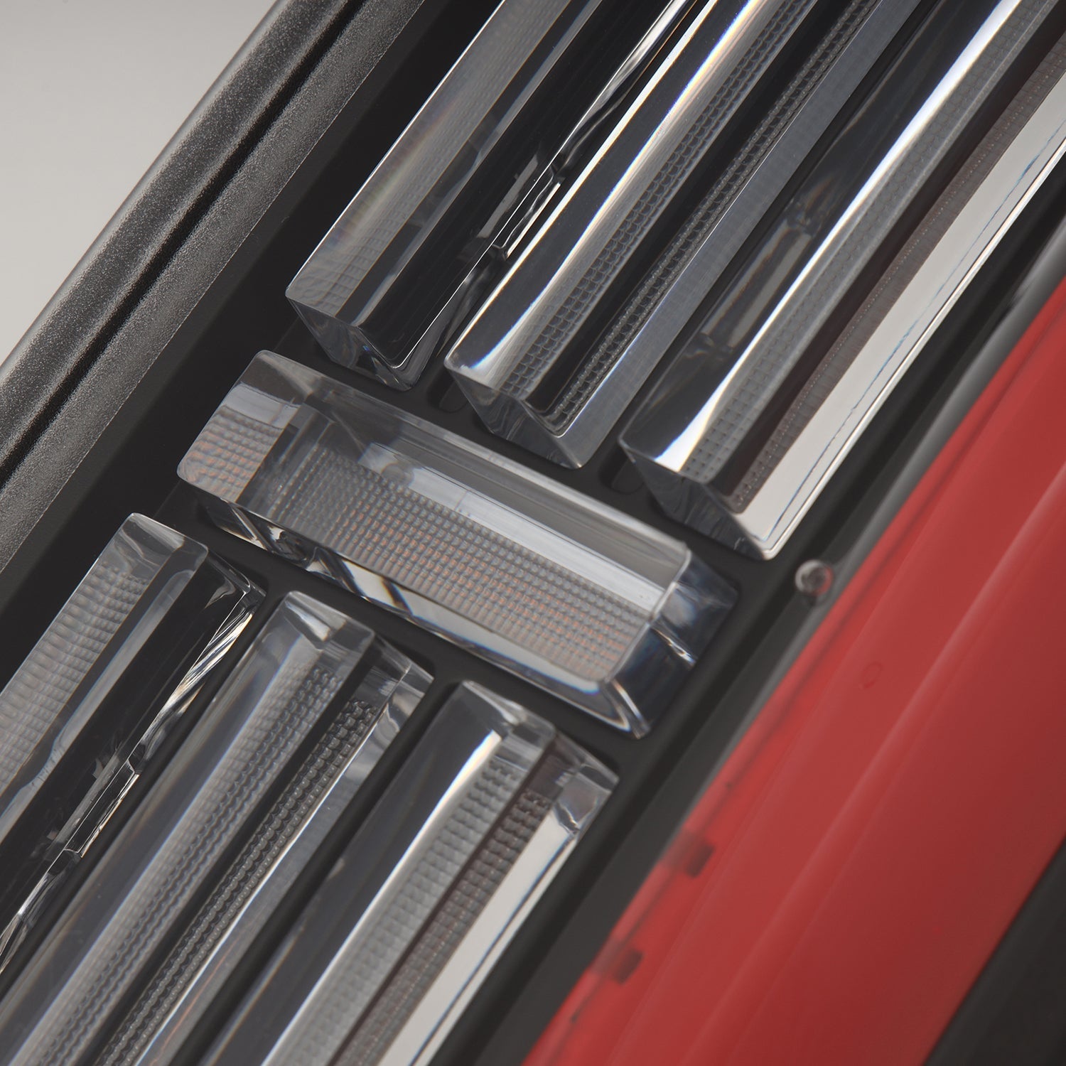 The trapezoidal prisms illuminate with red LEDs for parking lights, intensifying when braking. For turn signals, amber LEDs activate across the prisms and the LED side panel in a dynamic sequential flow, adding a modern touch. The side LED tube mirrors the signature look of the 3rd Gen Tundra, providing additional parking light functionality, while the central LED tube lights up with white LEDs as a reverse indicator.