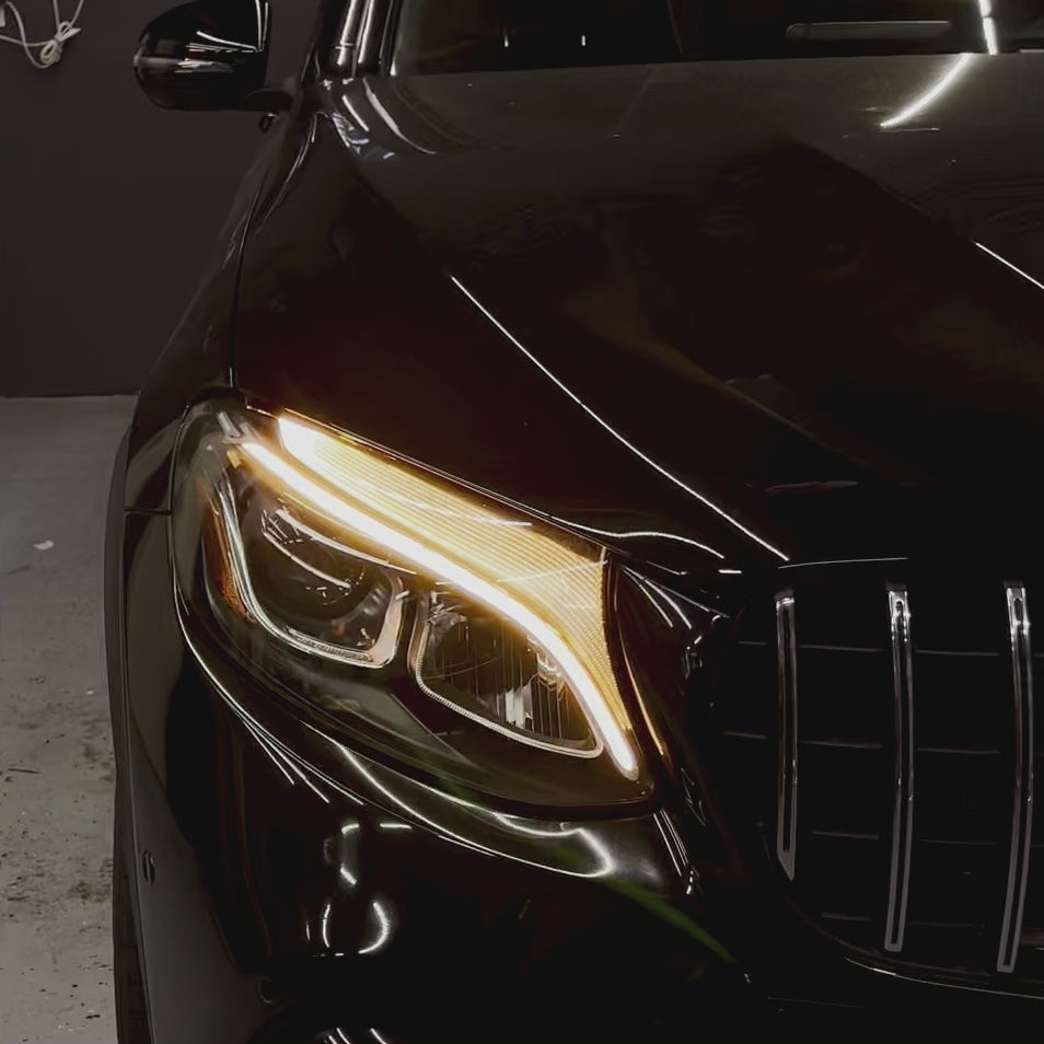 The 2016 - 2019 GLC facelift LED headlights feature an elegant overarching LED bar across the headlight to easily distinguish the vehicle from the plane jane SUVs on the road. Take it to the next level with our RGB DRL module upgrade to add the capability to change the DRL to any color you want at any time via Bluetooth app!